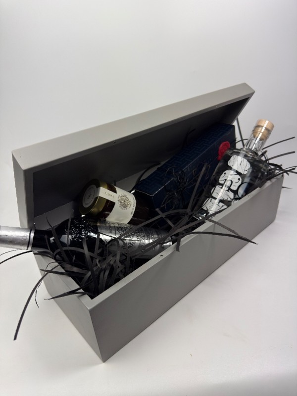 Γκρι ξύλινο κουτί με γαλλικό κρασί και απόσταγμα Rocks & Grapes