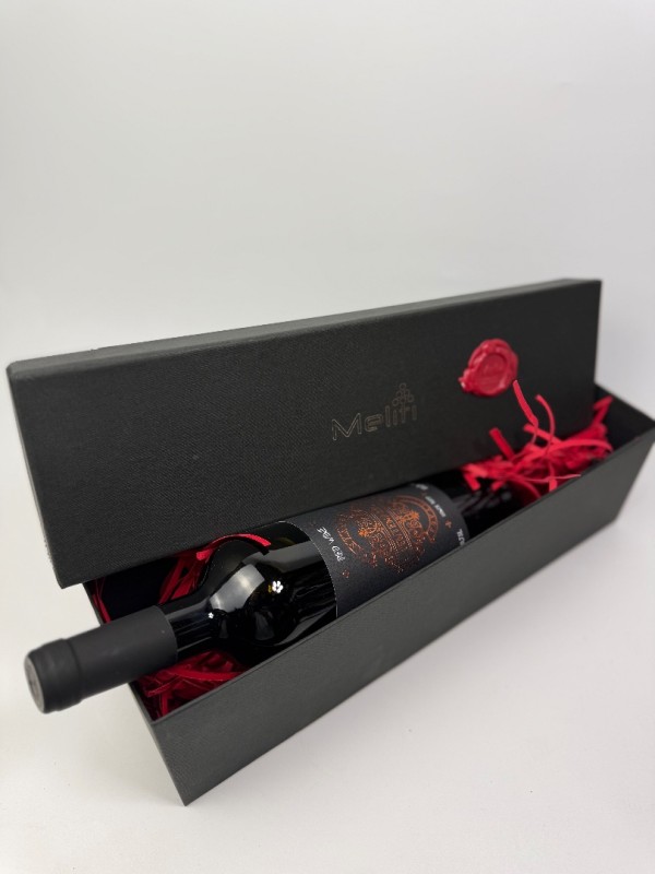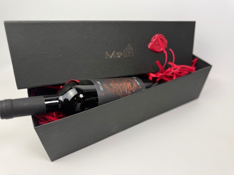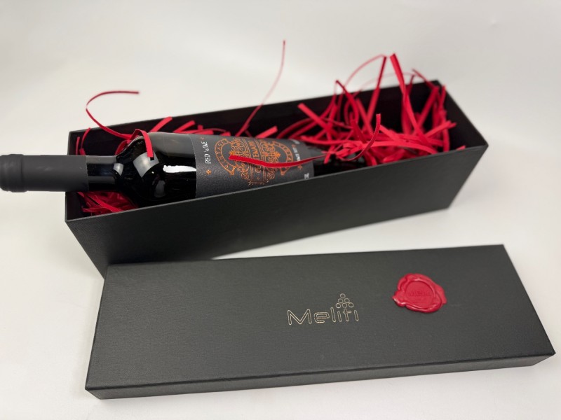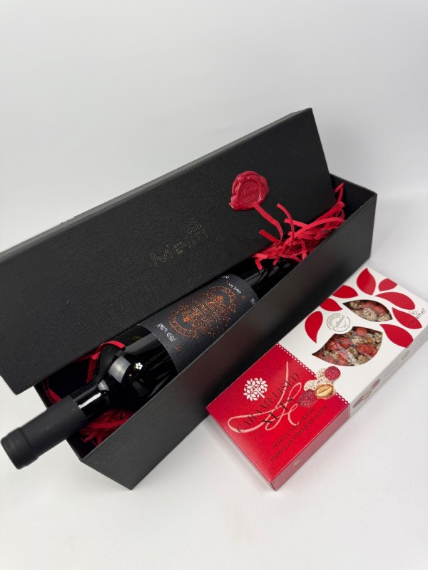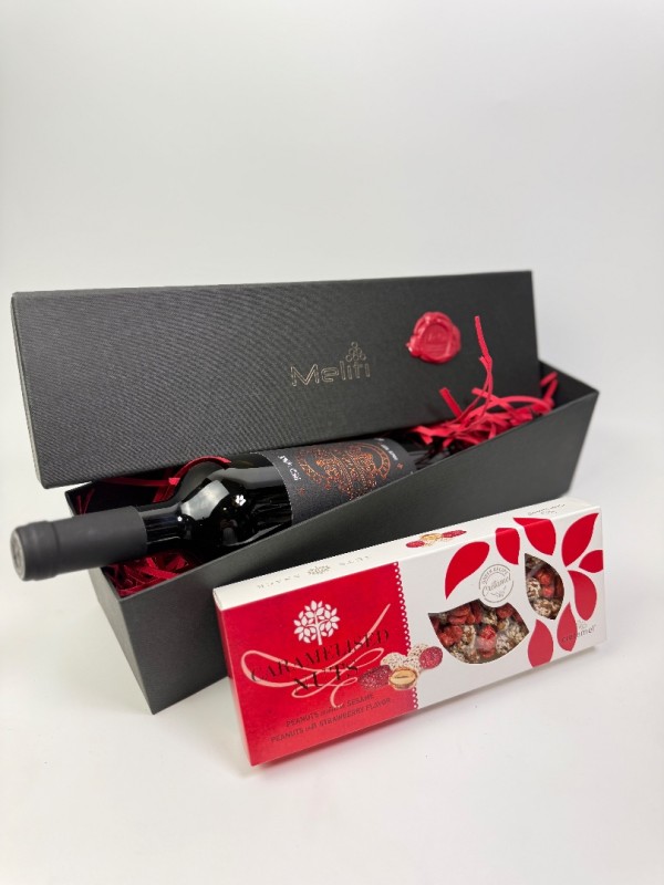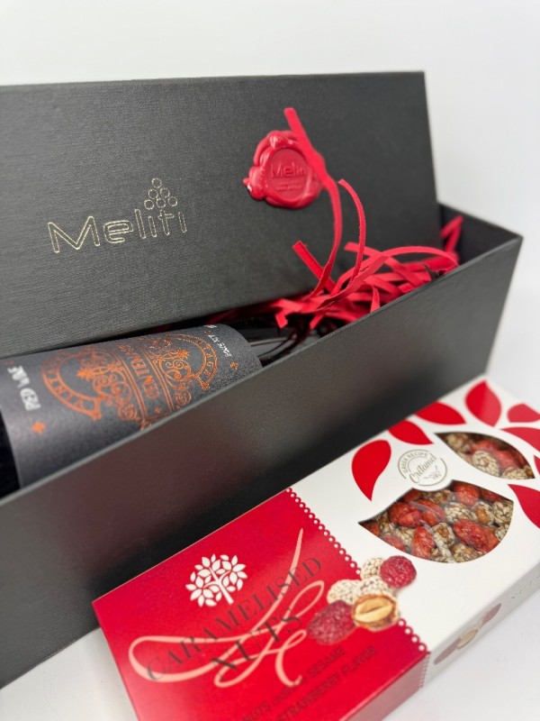 Στο εσωτερικό του περιέχεται μία φιάλη ερυθρού κρασιού από την περιοχή της Νεμέας, ποικιλίας Merlot, γνωστή για το μαλακό και φρουτώδες προφίλ της, καθώς και μία συσκευασία καραμελωμένων ξηρών καρπών, που συνοδεύουν άριστα το κρασί.