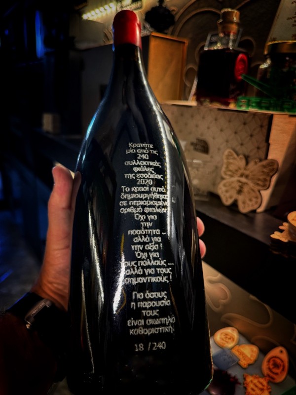 Κατόπιν επιθυμίας, μπορείτε να ζητήσετε να χαράξουμε το δικό σας μήνυμα ή όνομα πάνω στη φιάλη ή στο ξύλινο κουτί — κάνοντάς το το απόλυτο προσωποποιημένο δώρο,ακόμα και την ίδια μέρα για παραλαβή από την Έδρα μας ή αποστολή σε εσάς με κούριερ την επομένη !
